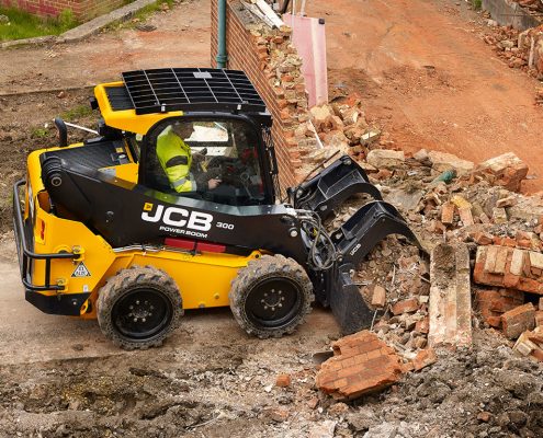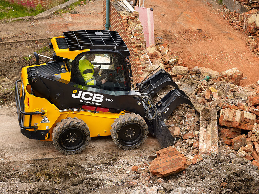 The JCB 300 Vertical Lift Skid Steer has a rated operating capacity of 1361 kg and the 55 kW JCB EcoMAX engine.