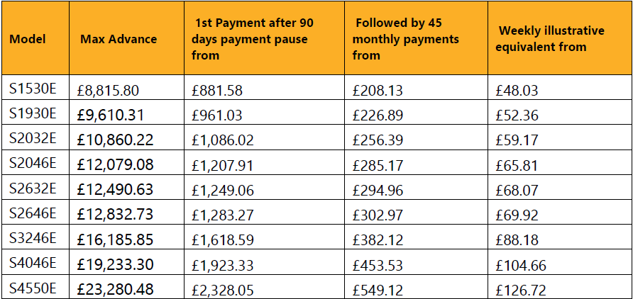 This Hire Purchase offer is available on new JCB Access models. The VAT is payable on signing, 1st payment payable after the 90-day payment pause and the 45 monthly payments will commence 30 days later (120 days after signing).