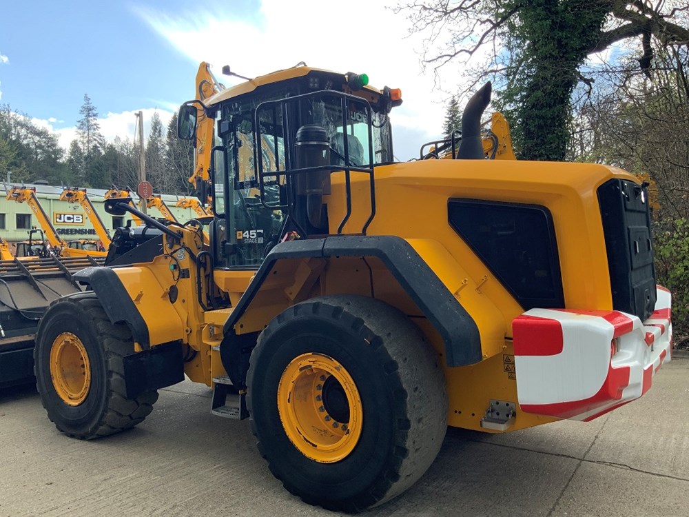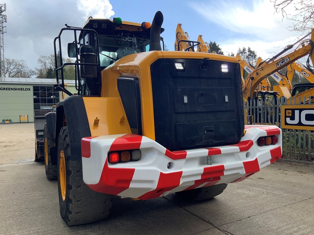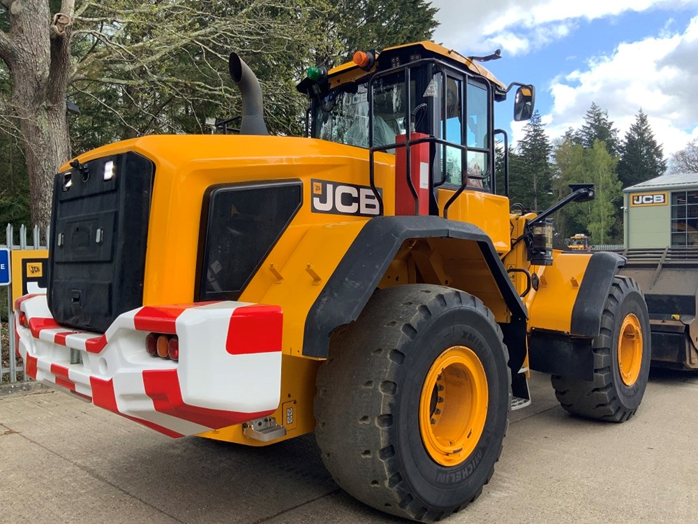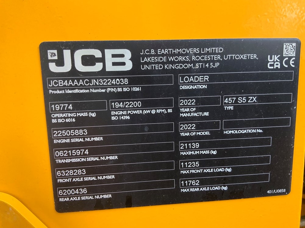 Stage V | Front Quick Hitch | 4.5m³ High‑Tip Bucket | Repainted This used 2022 JCB 457 ZX Stage V wheel loader is a high‑performance loading shovel designed for demanding quarrying, waste, recycling and bulk material handling applications. The machine has been professionally repainted, presenting exceptionally well, and is supplied with a front quick hitch and Ulrich 4.5 cubic metre high‑tip bucket, making it ideal for high‑reach loading operations. Equipped with a high‑spec cab, smooth 5‑speed transmission, and Michelin XMINED2 PRO radial tyres, the JCB 457 ZX delivers excellent traction, productivity and operator comfort. The standard height loader arms with 3‑spool joystick control and ZX autolube system ensure precise handling and reduced maintenance downtime. Key Features: Used 2022 JCB 457 ZX Wheel Loader Stage V emissions compliant Repainted machine Front industrial quick hitch with pin isolator valve Ulrich 4.5m³ high‑tip bucket Standard height loader arms 5‑speed transmission with auto‑lock front axle Michelin XMINED2 PRO 23.5R25 L5 tyres ZX autolube system UK‑spec machine (UK language pack) Cab, Safety & Specification: High‑spec enclosed cab Climate control with ATC Full cab with carbon air intake filter Full wheel fenders Hydraulic reverse cooling fan